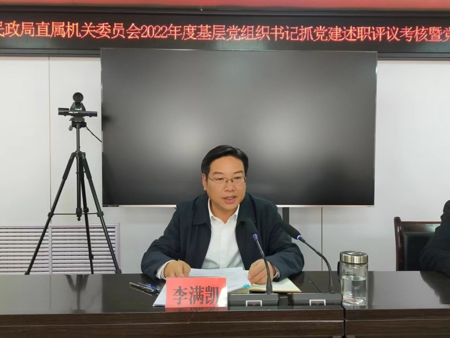 3月3日下午,市民政局召开2022年度基层党组织书记抓党建述职评议考核暨党风廉政建设工作会议,传达贯彻省、市及市直机关抓基层党建述职评议考核会议精神,听取市直民政基层党组织书记抓党建述职,并进行点评和评议。市民政局党委书记、局长李满凯主持并讲话,市纪委监委驻市财政局纪检监察组董新军出席指导会议。 李满凯对市直民政各基层党组织2022年度党建工作做出充分肯定,分析了存在的问题和不足,就认真抓好2023年基层党建、党风廉政建设和意识形态工作作了安排部署。 李满凯强调,要突出“创”字,争做三个表率,建设模范机关;把握“新”字,以思想破冰开创机关党建工作新局面;注重“活”字,不断增强机关党建的时代性规律性创造性;强化“动”字,推动机关党建工作成势见效。